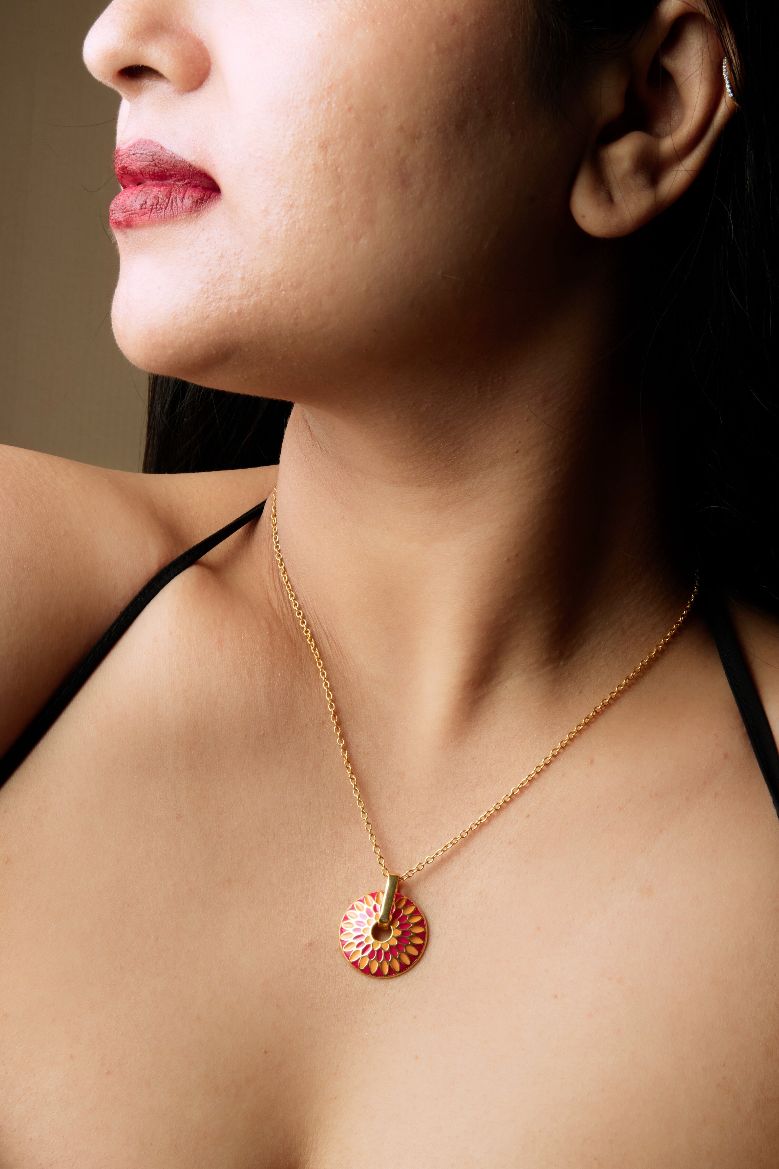 Dive into a kaleidoscope of colour with this golden necklace, made with anti-tarnish brass and plated with 18kt gold tone plating, splashed with colourful enamel.