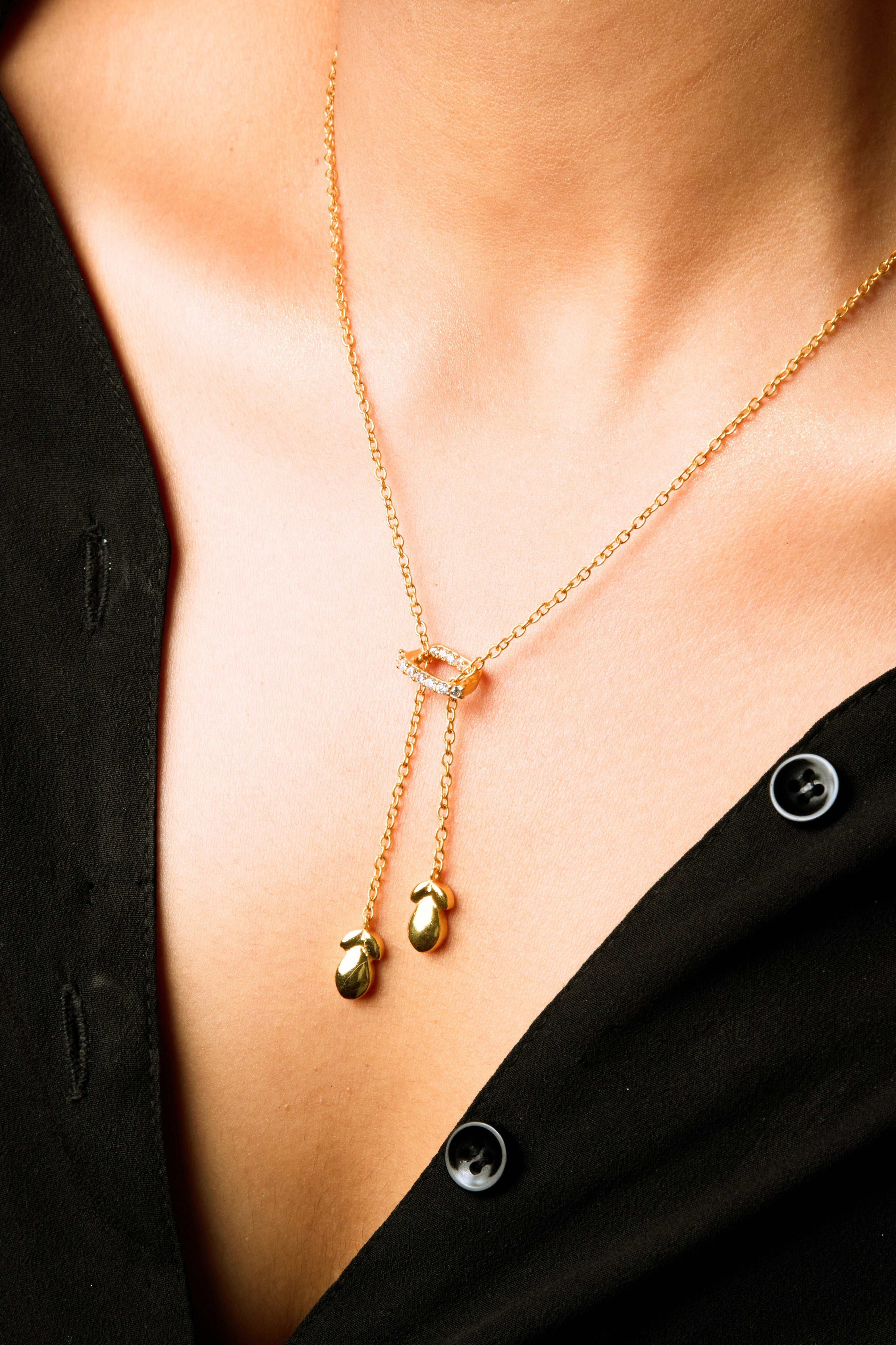 Elegant teardrops with leaves and a gold lariat chain, all made with anti-tarnish brass and plated with 18kt gold tone plating, combine in this elegant necklace to add a sophisticated touch.